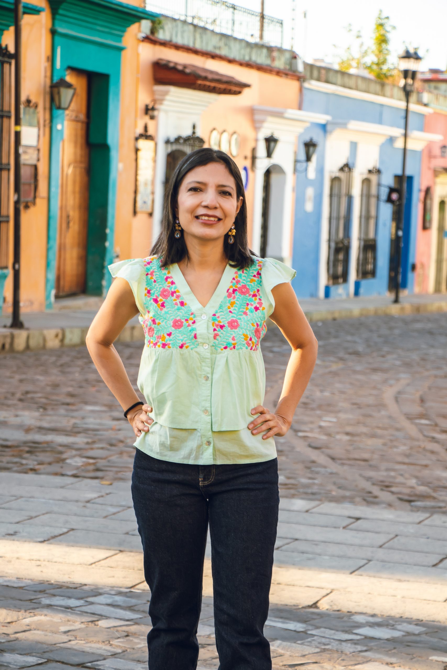Blusa dos olanes color menta, manga de olán, con bordado a mano de San José del Progreso