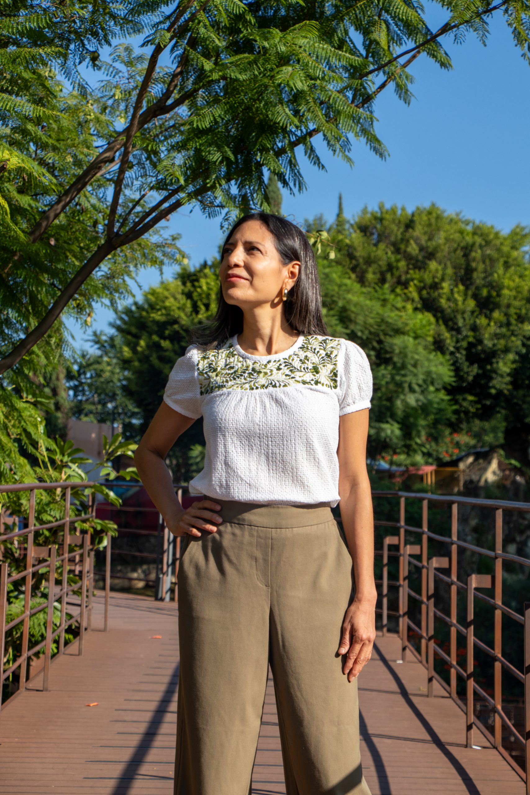 Blusa blanca de manta boradada, cuello redondo, con manga corta, bordado de San José del Progreso en tonos verdes: olivo, militar, amarillo.